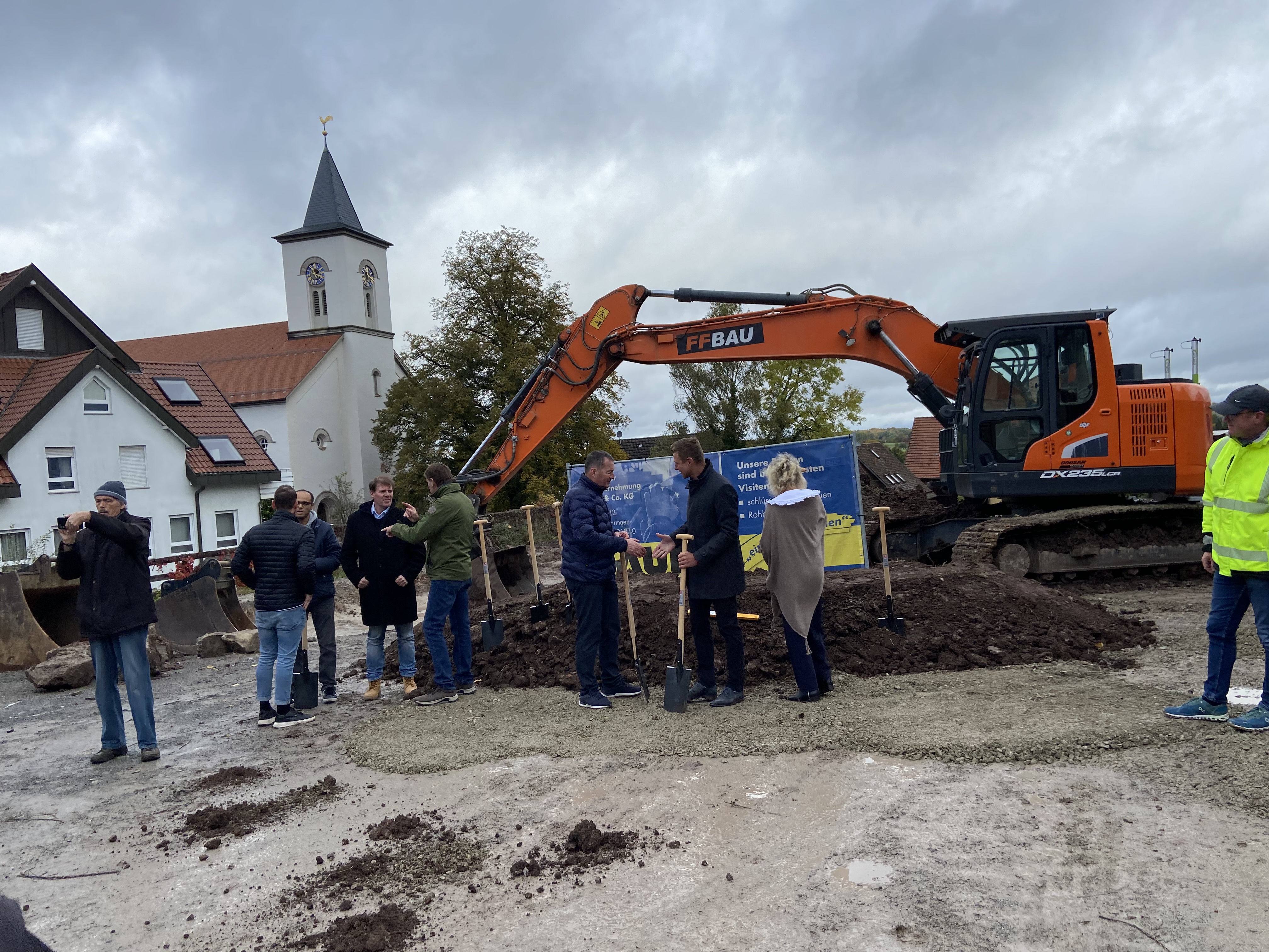 Zusammen mit dem Kommunalbau Mainhardt, der Stadt Mainhardt, beteiligten Baufirmen und Nachbarn konnte am 27.10.2023 der Spatenstich für eines neues Wohn- und Geschäftshaus inmitten von Mainhardt gefeiert werden.