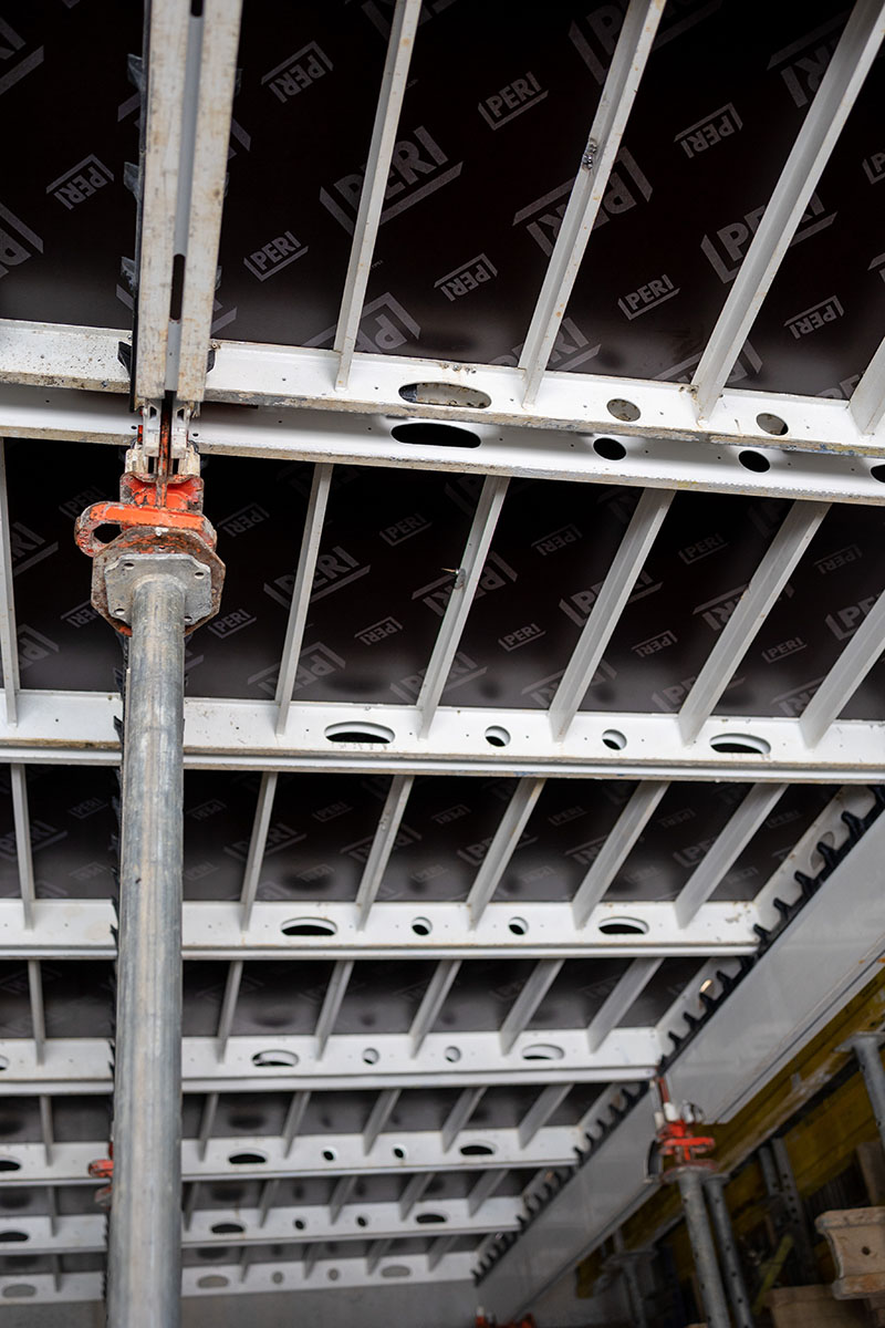 Fortschrittlich in der Architektur und in der baulichen Umsetzung. Bei der Deckenschalung kamen handliche und leichte Systembauteile zum Einsatz. Aufwendiges Bolzen oder Schrauben bei Kopf-Stützenverbindungen entfallen durch den Klinkenschnellverschluss. Ebenso entfallen aufwändiges Einmessen von Stützen und Trägern. Das kraftsparende Arbeiten ist deutlich weniger personalintensiv.